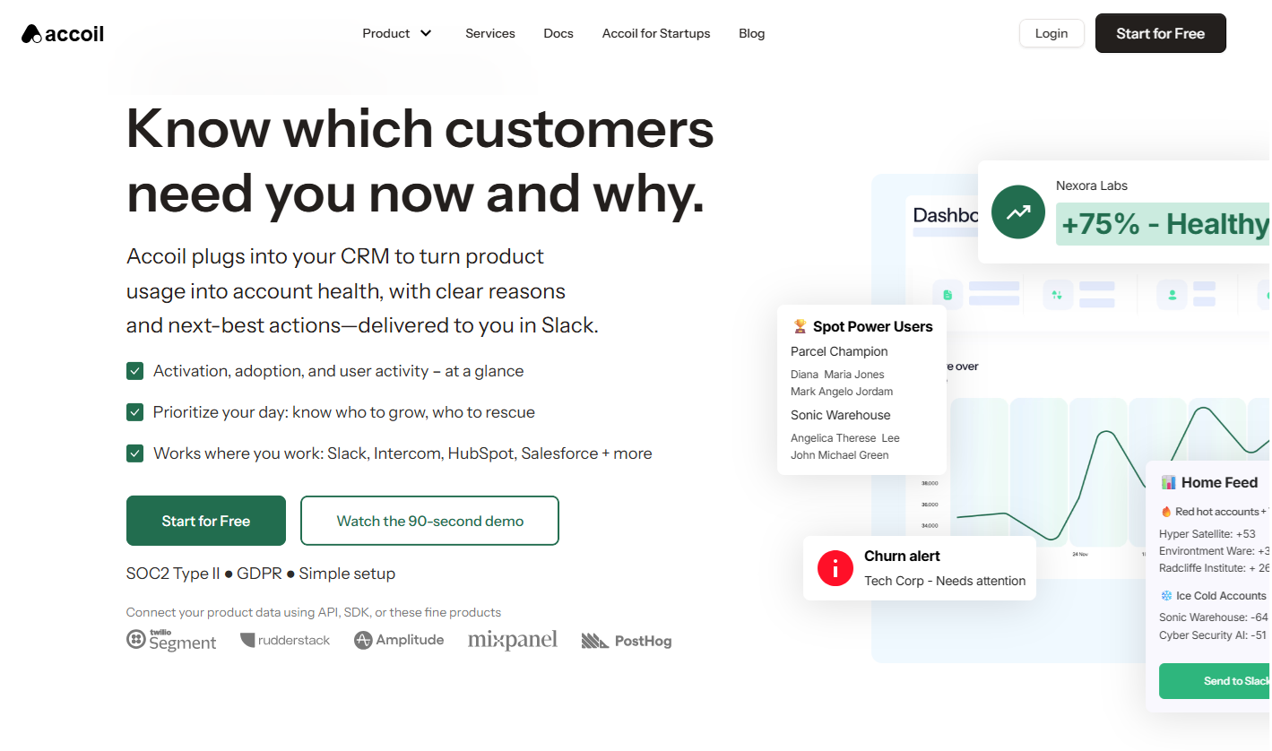 Behind the scenes, Accoil connects to your product data and rolls user actions up to company accounts, scoring engagement based on weighted behaviors. Then, instead of living in yet another dashboard, your team gets churn-risk alerts straight into Slack, complete with plain-English context explaining what changed and why.