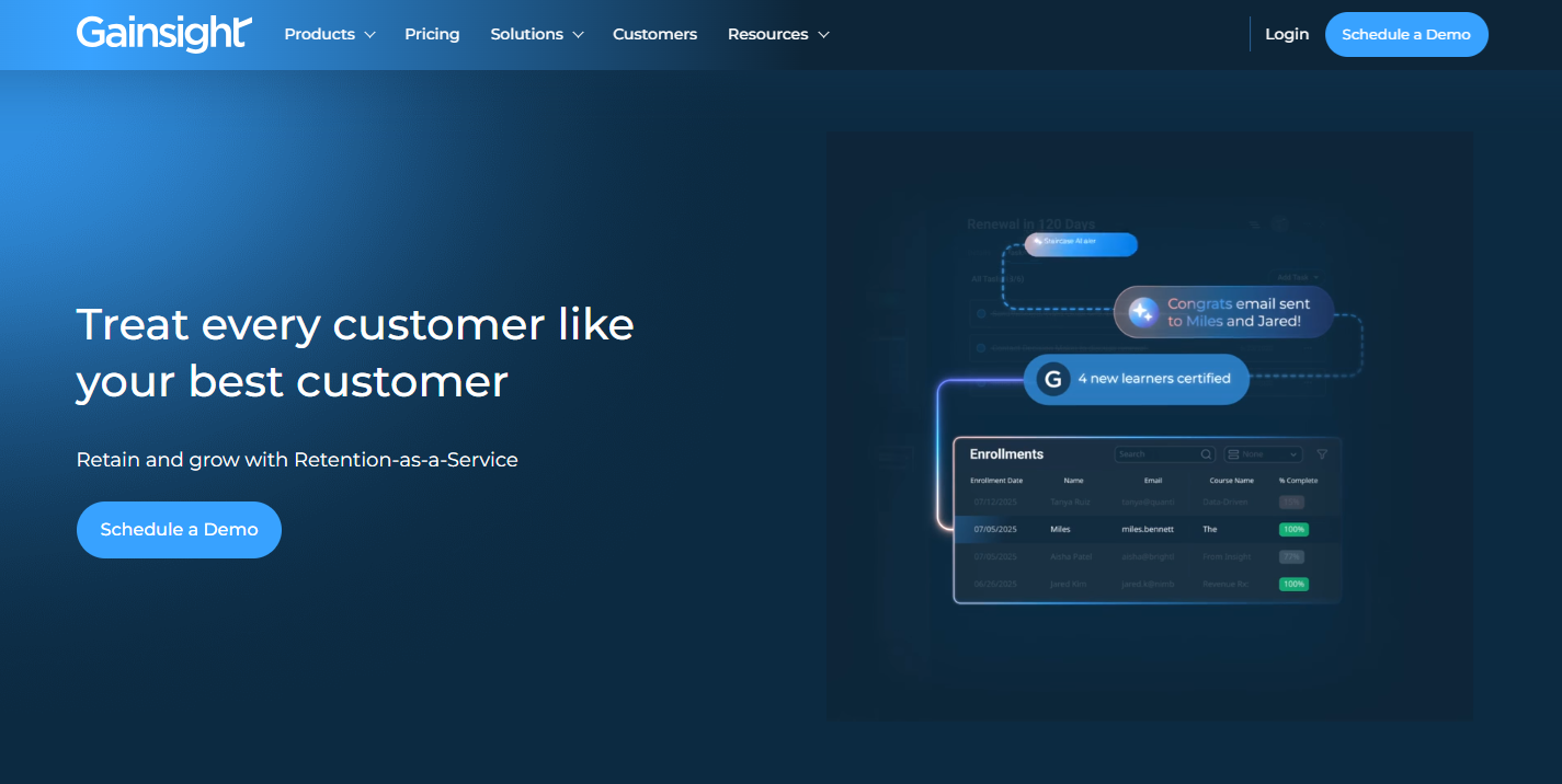 Tools like Gainsight (and ChurnZero) are popular among enterprise platforms because they combine health scoring, playbooks, surveys, renewals forecasting, and executive reporting.