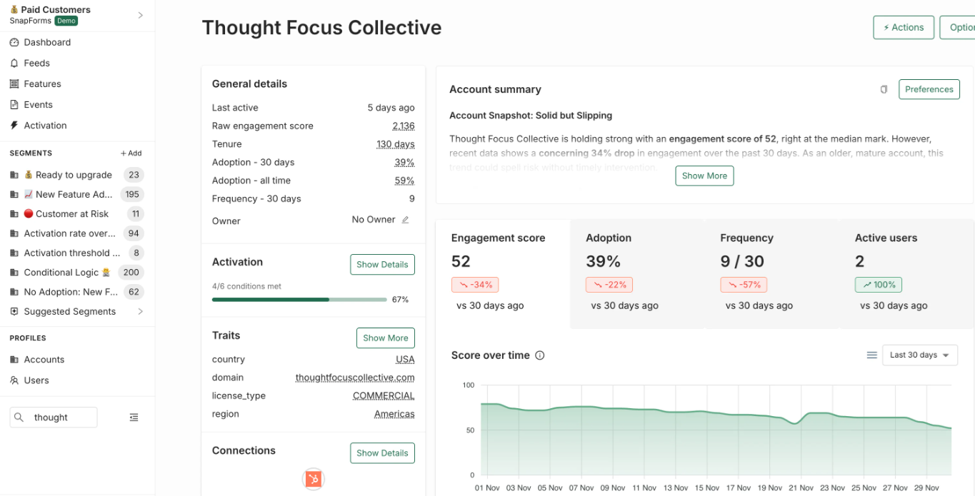 Behavioral segments update automatically as customers use your product, keeping targeting relevant without you having to manually manage lists. Engagement scores sync with Salesforce and HubSpot, so risk signals sit right alongside pipeline data. And with no SQL (Structured Query Language) and no analyst dependency, teams get fast answers to the only question that really matters: who's at risk, and why.